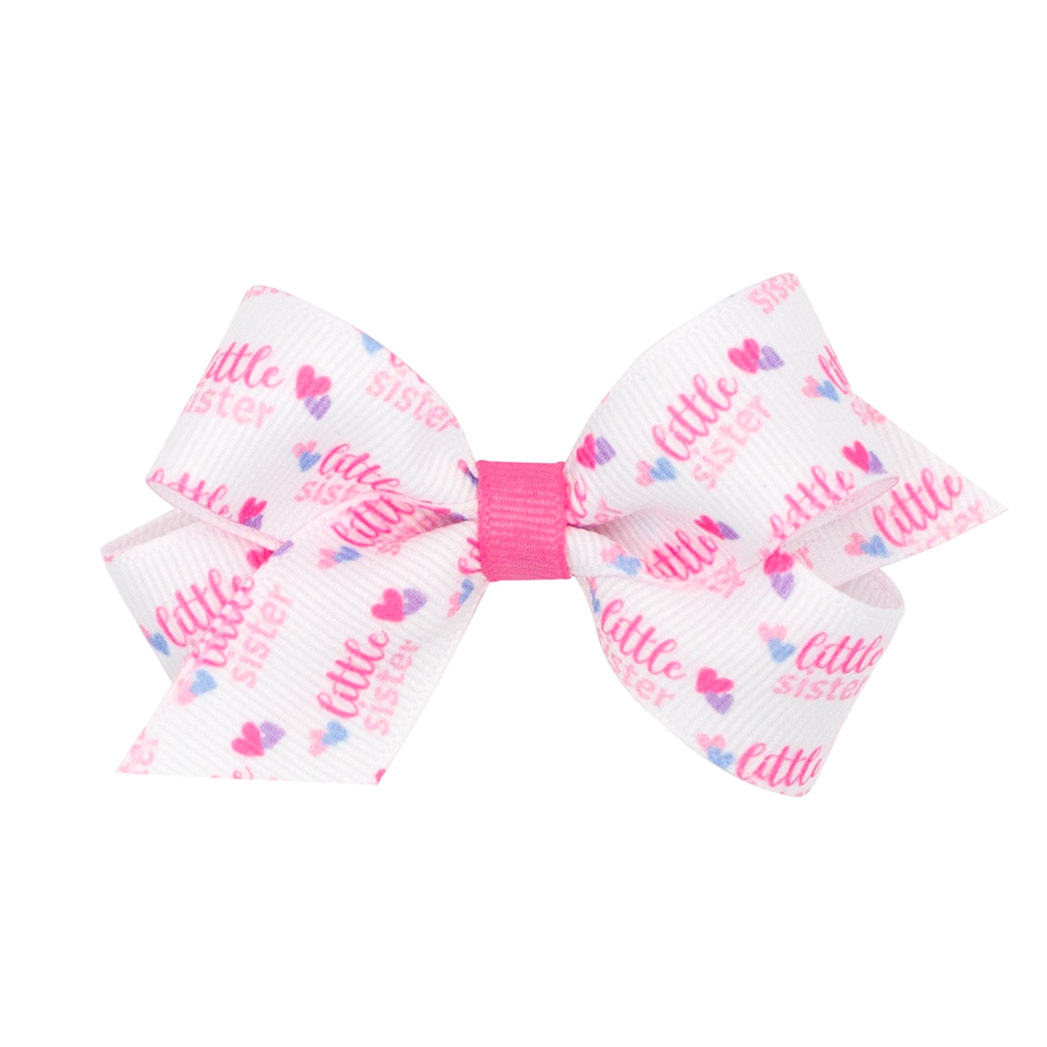 Declare that little sis status loud and proud with this printed mini cotton overlay bow. Approximate Size: 3.25" x 2" (7/8" Ribbon). Matching big sister bow available in medium or king size!