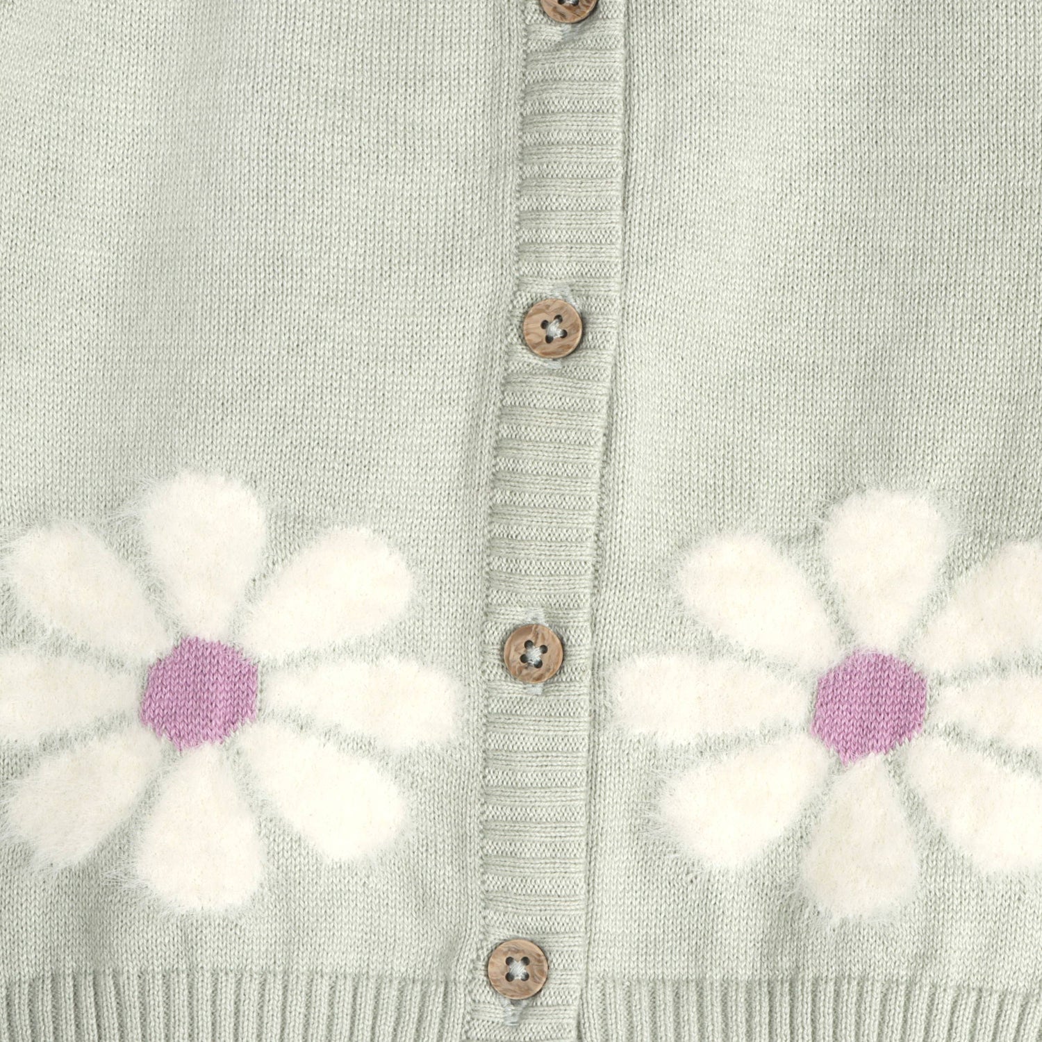 The 100% organic cotton Sweater Knit Cardigan features delicate, fuzzy Flower embroidery for a soft, fun texture and ultra-soft hand feel. Included: Matching organic sweater knit pants with lavender embroidered hearts. - Five-button front opening. - All-season, lightweight, and breathable organic cotton, comfy and cozy. - Eco-friendly, chemical-free, non-toxic, pure, natural & organic baby clothes.