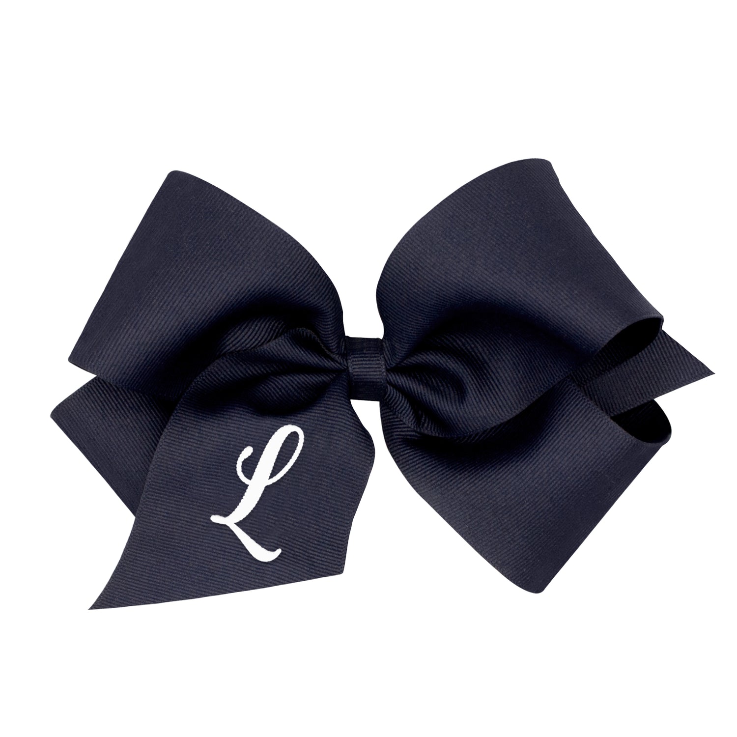 Make your favorite little girl feel special with our monogrammed king grosgrain hair bow. This navy hair bow for girls is embellished with a white initial and is available in 23 different letters. This bow is sure to stay in her hair all day with our patented WeeStay™ no-slip hair clip.