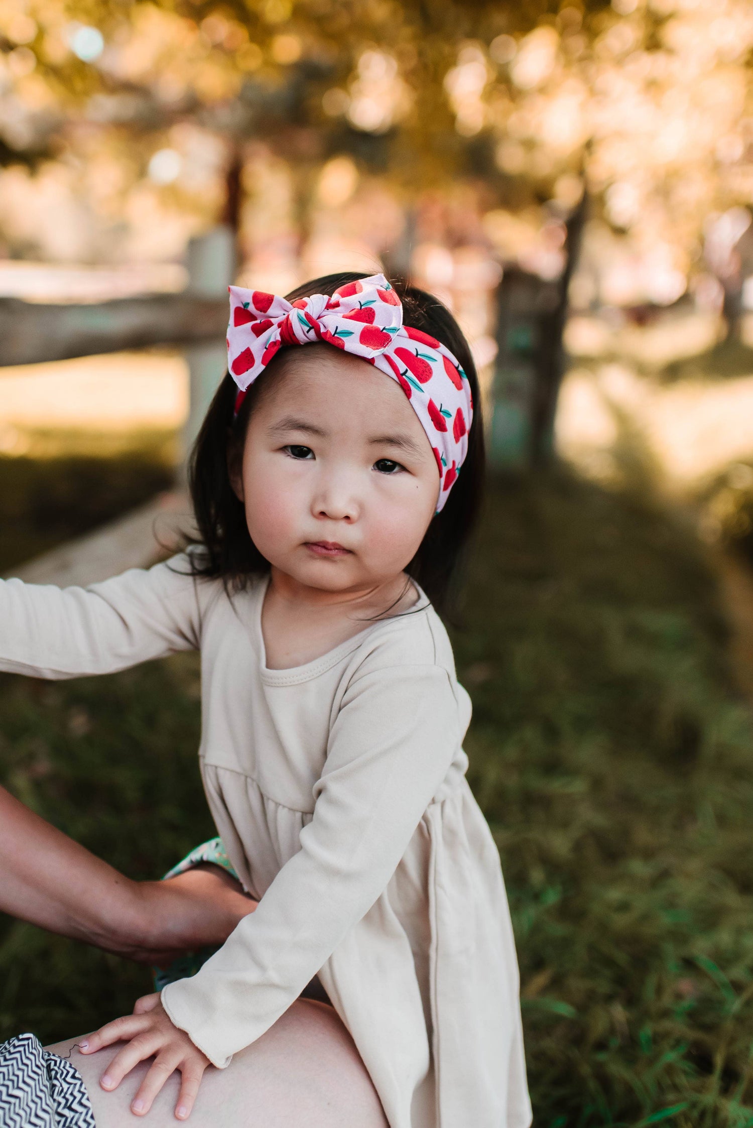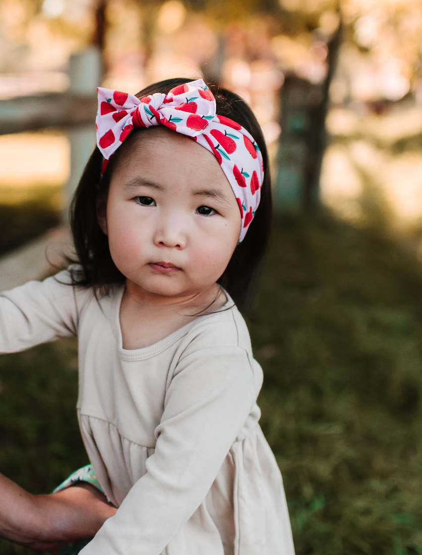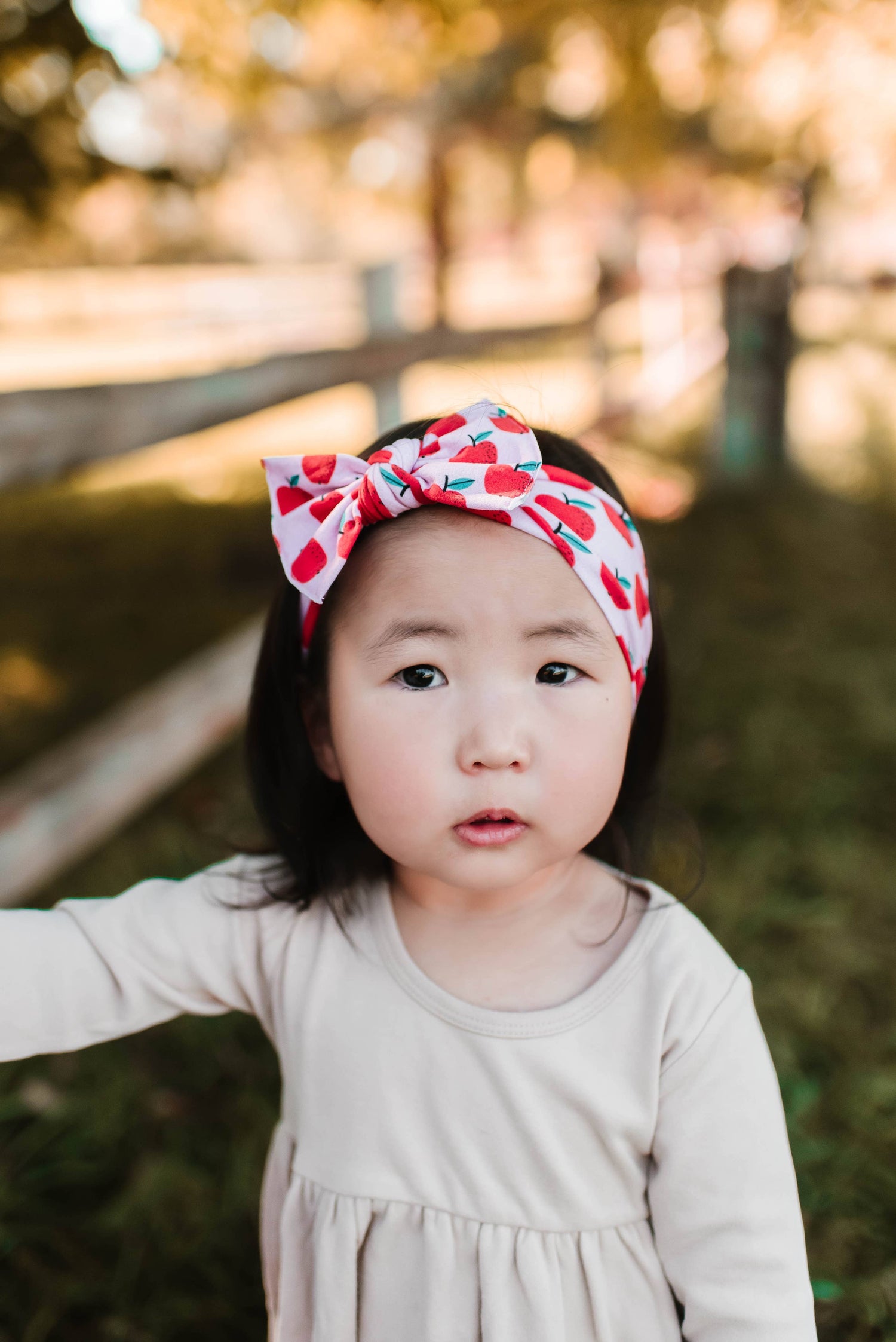 Keeping it fresh all year long with the Printed Knot! With a variety of trendy prints to choose from, your babe is sure to look darling in any of them. Most prints are limited stock, to keep new prints coming in, so snag them fast! This headband is one size fits most and the size cannot be adjusted. The headband is sewn at a 6.5" diameter (13" circumference), keep in mind that measurement is before it stretches. We feel this is the perfect size for our soft nylon to fit a newborn and stretch comfortably as they grow into childhood. The bow measures approximately 4" across. The exposed stitching detail and a raw edge is signature Baby Bling! A fun feature of the prints is our logo printed to complement each design.